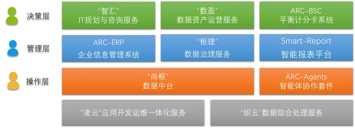 管理層,ARC - ERP企業(yè)信息管理系統(tǒng),整合企業(yè)人、財(cái)、物等資源,實(shí)現(xiàn)生產(chǎn)、采購、銷售等業(yè)務(wù)流程數(shù)字化管控,提升運(yùn)營效率;“樞理”數(shù)據(jù)治理服務(wù),規(guī)范數(shù)據(jù)標(biāo)準(zhǔn)、清理數(shù)據(jù)質(zhì)量問題、保障數(shù)據(jù)安全,為管理決策提供可靠數(shù)據(jù)底座;Smart - Report智能報(bào)表平臺,自動抓取多源數(shù)據(jù),快速生成可視化報(bào)表,實(shí)時(shí)呈現(xiàn)業(yè)務(wù)動態(tài),輔助管理者精準(zhǔn)洞察、高效決策 。